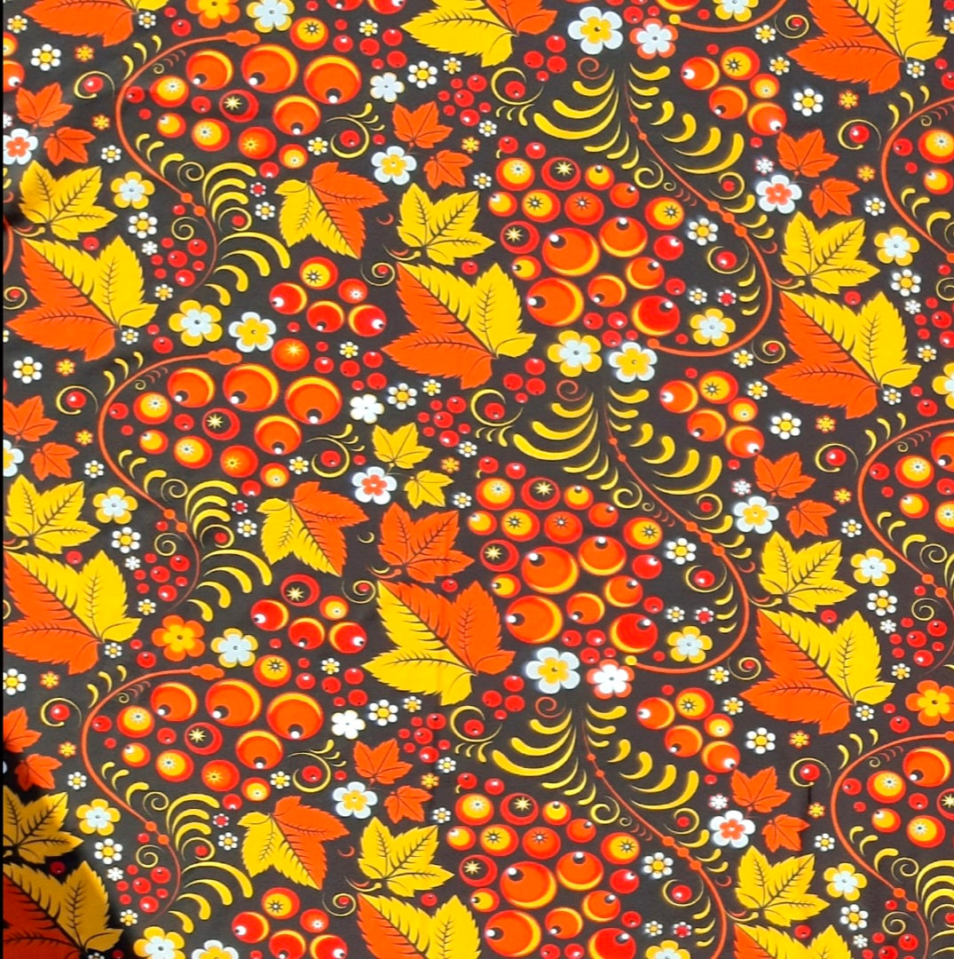 "Featuring a stunning Autumn print in rich golden yellow and burnt orange tones , this fabric features autumn leaves on a dark brown background"