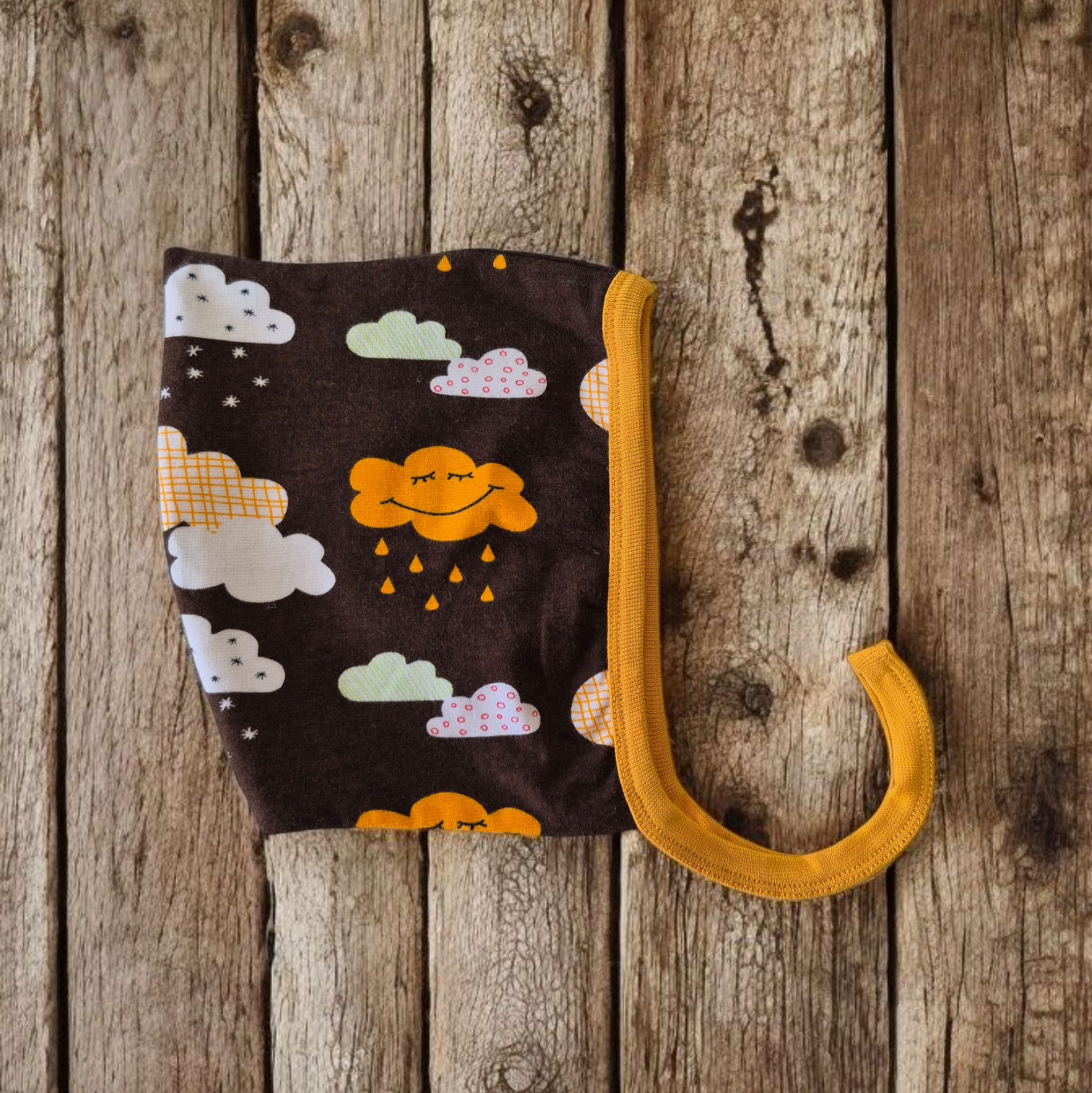 Happy Cloud is a beautiful fun children's print featuring Smiling Clouds and raindrops in a pallete of Ochre and Dark Brown.