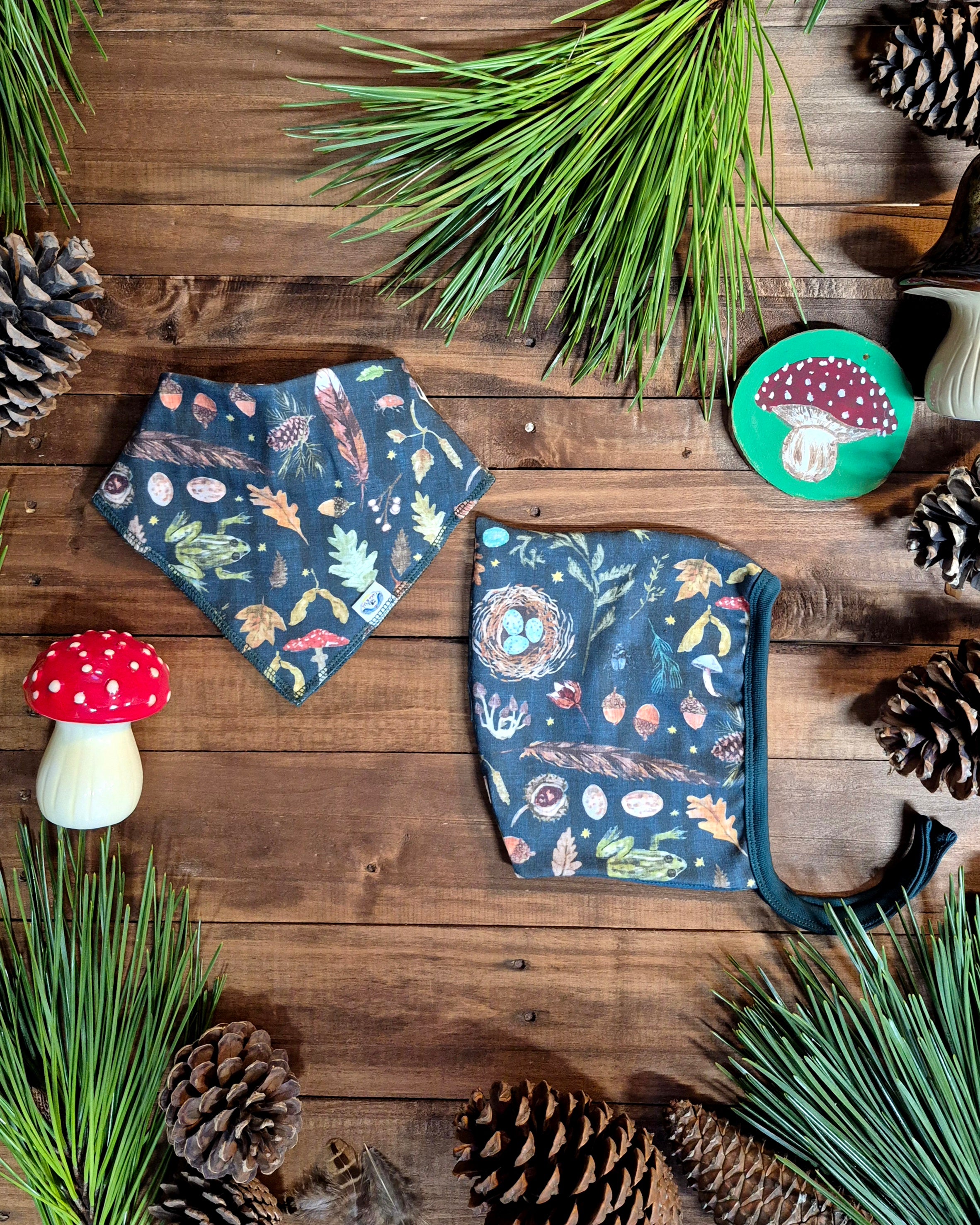 Featuring a beautiful Nature inspired print with Spring nests , autumn leaves , mushrooms and feathers on a white background" perfect for your forest explorers.