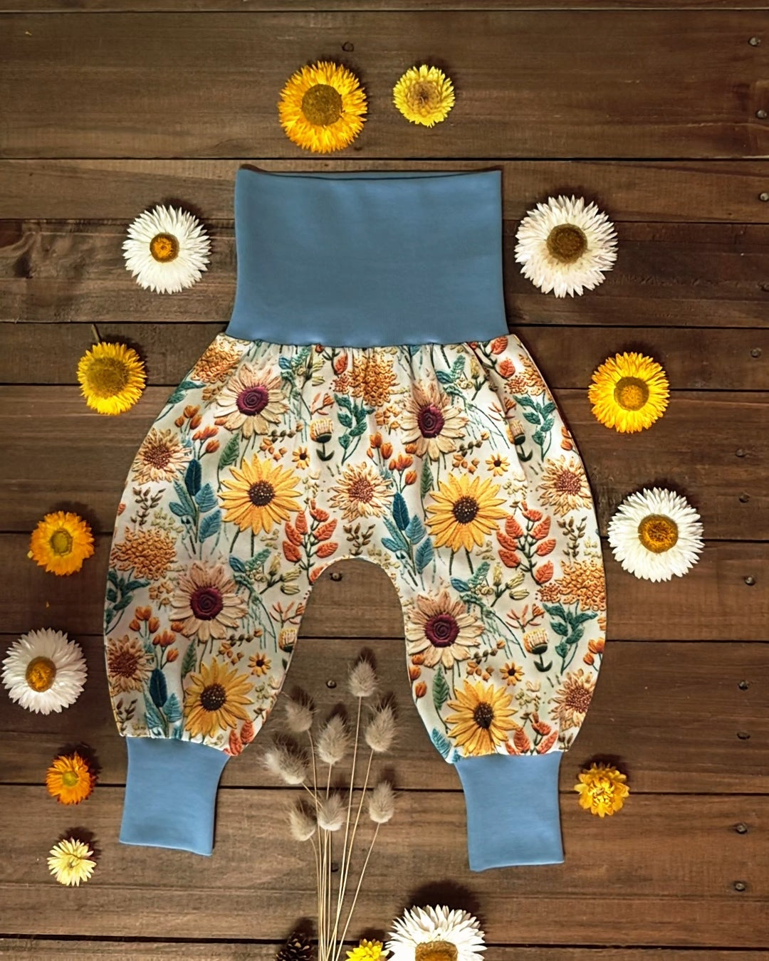 Wrap your little one in comfort & Style  with our beautifully soft Sunflowers Harem Trousers, handcrafted in West Cork using GOTS-certified organic cotton. This soft stretchy fabric is gentle on sensitive skin and kind to the planet – perfect for eco-conscious families.