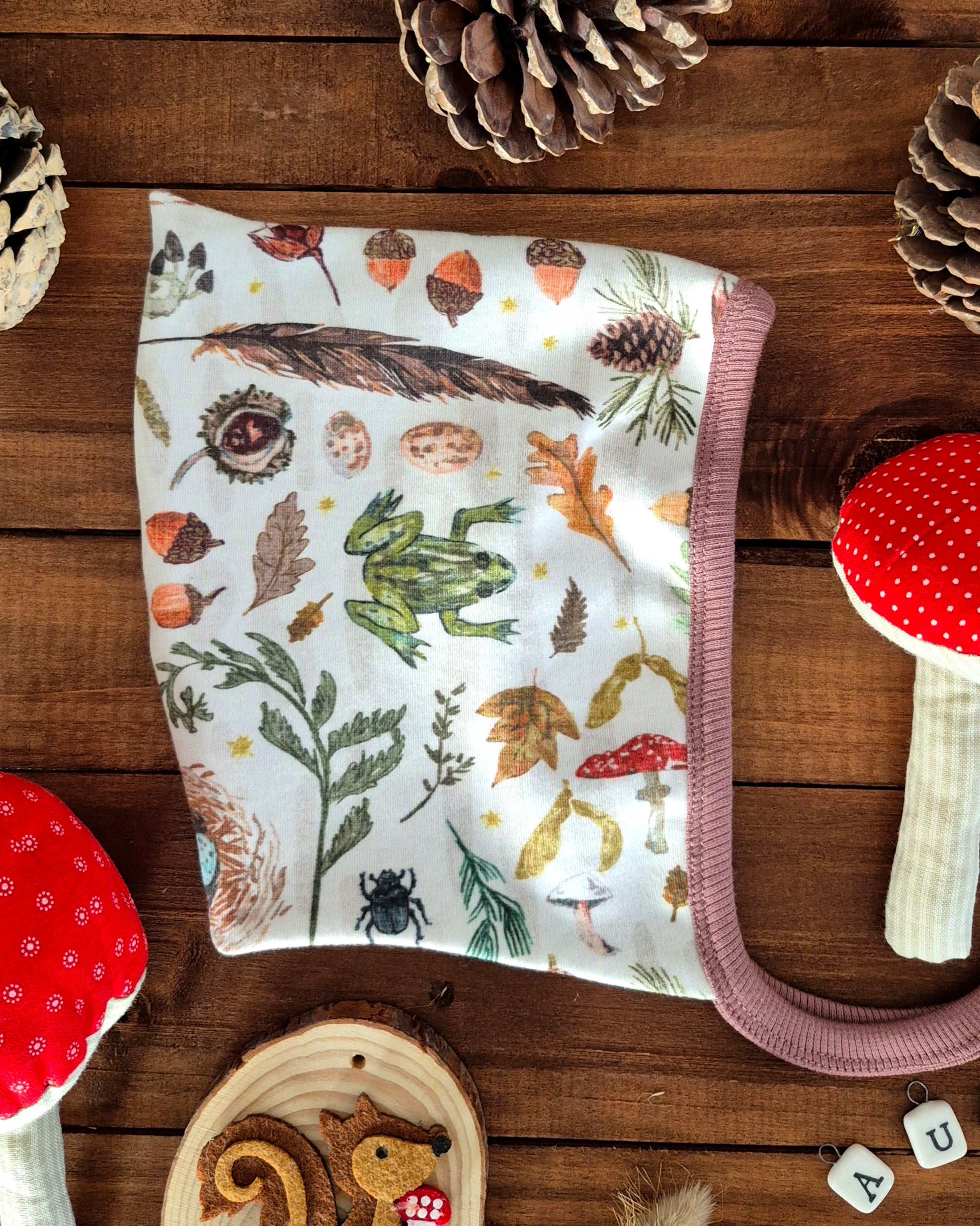 " Featuring a stunning Autumn print  with autumn leaves , mushrooms and feathers on a white background" perfect for your forest explorers for Autumn"