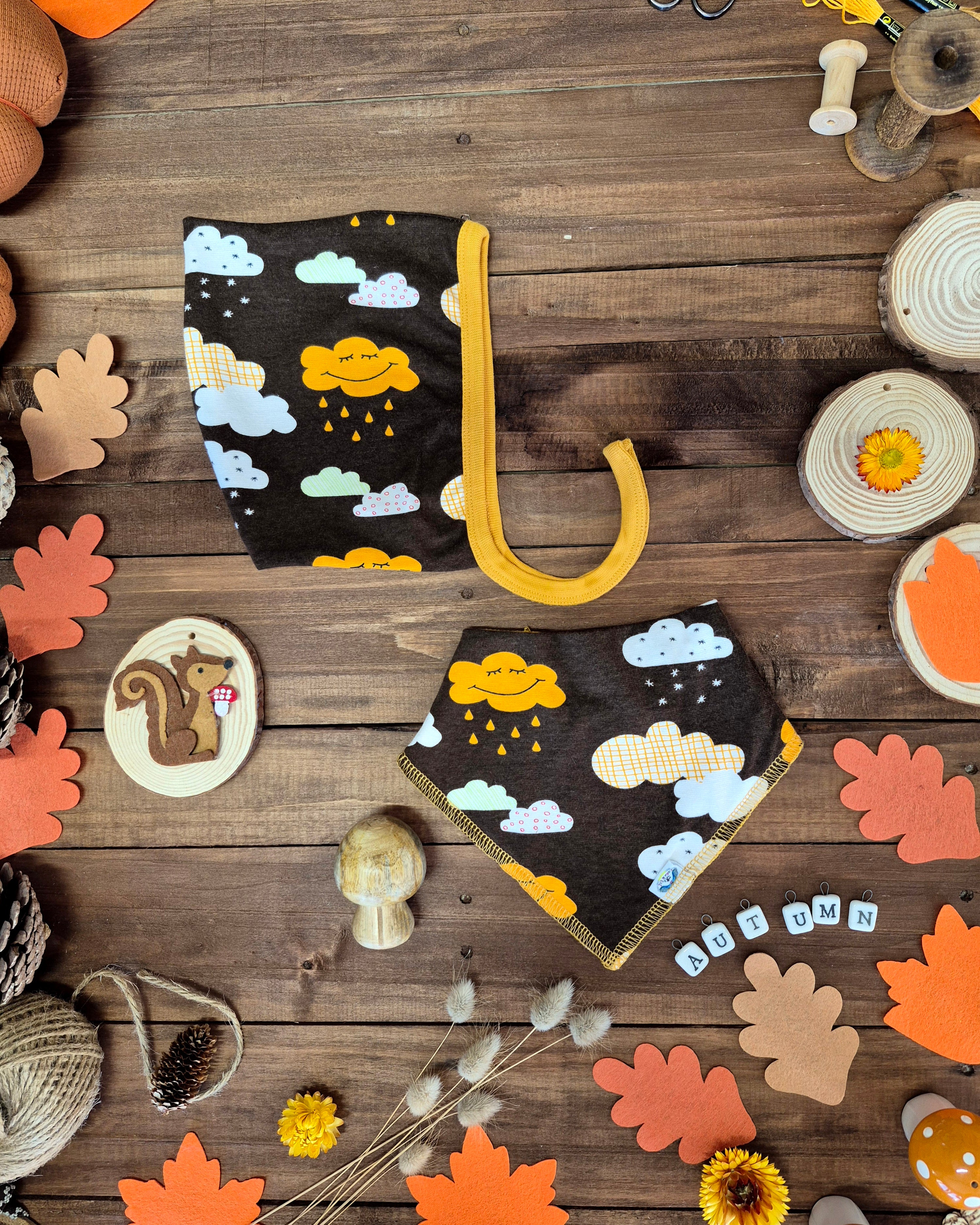 Happy Cloud is a beautiful fun children's print featuring Smiling Clouds and raindrops in a pallete of Ochre and Dark Brown.